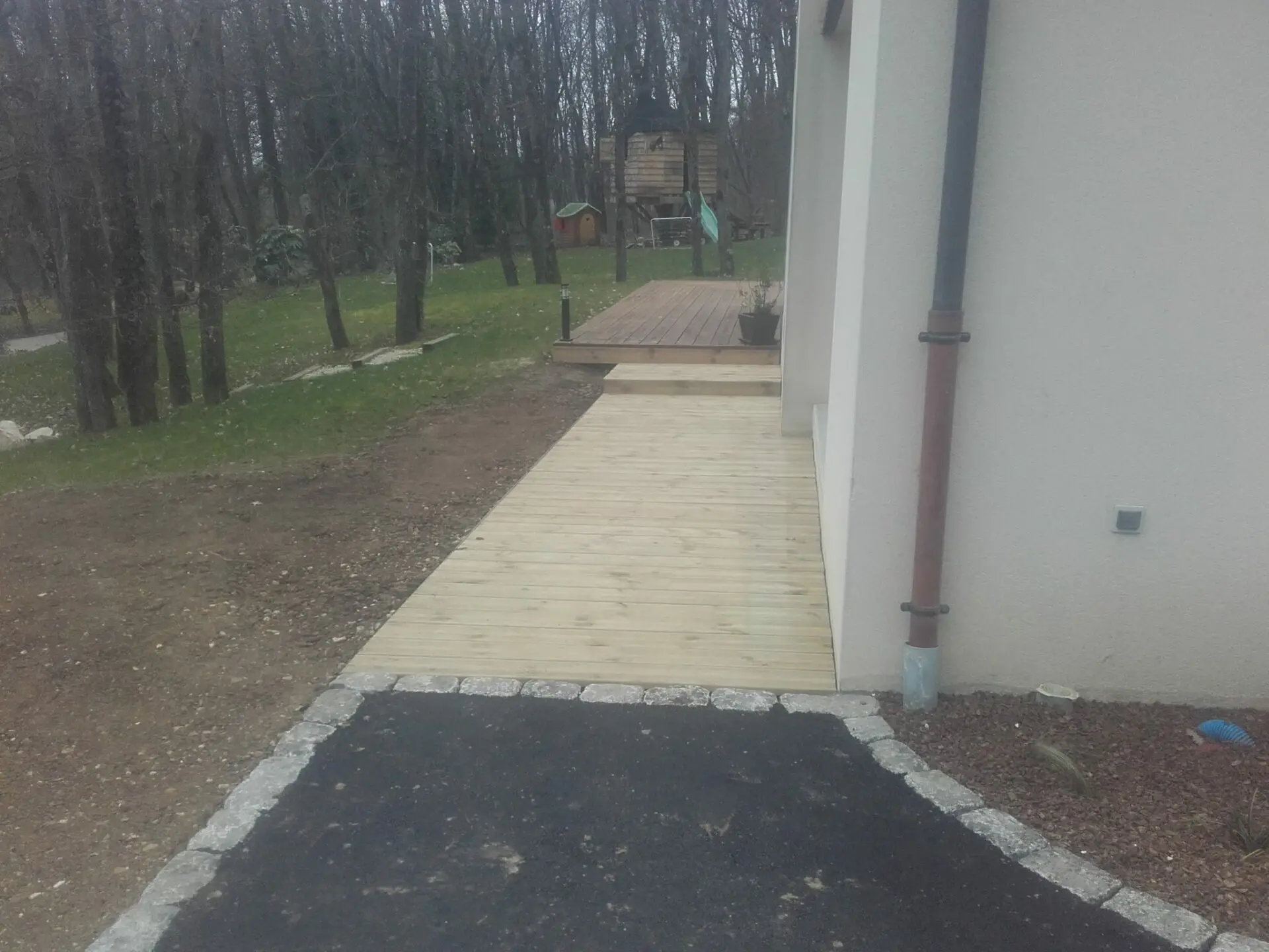 Afin de faciliter l’accès à la terrasse, nous avons réalisé un platelage en bois côté jardin qui sera par la suite délimité par du gazon , s’ensuit un enrobé avec une bordure en pavé de ville pour créer un accès propre à la maison.